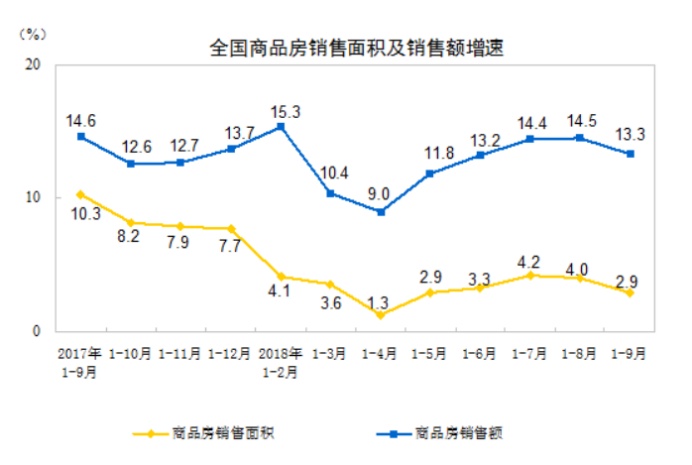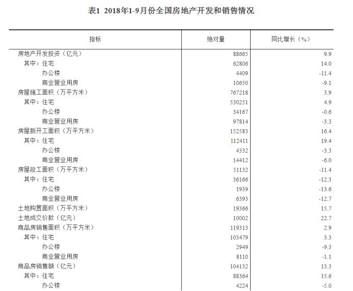 1-9月份,商品房销售面积119313万平方米,同比增长2.9%,增速比1-8月份回落1.1个百分点。其中,住宅销售面积增长3.3%,办公楼销售面积下降9.3%,商业营业用房销售面积下降1.1%。