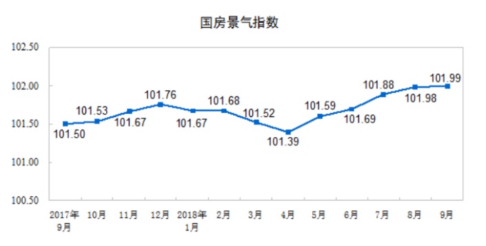 9月份,房地产开发景气指数(简称“国房景气指数”)为101.99,比8月份提高0.01点。