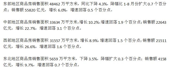 分地区上看,在今年1-9月份,我国东部地区和东北部地区房屋销售面积同比增速持续下降趋势;而中部地区和西部地区则继续保持小幅增长态势。