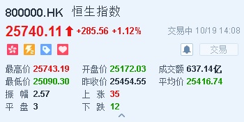 智通财经APP获悉,恒生指数今日低开高走,午后现反涨,截至14时08分,恒指涨285.56点或1.12%,报25740.11点,成交额637.14亿。