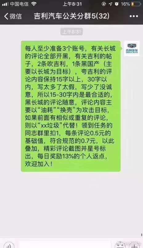 在发布这则声明的同时,长城汽车官方微博中也加入名为“吉利汽车公关分群5”的微信群截屏,图中要求“每人至少准备3个账号,有关长城的评论全部开黑,有关吉利的帖子,2条吹吉利,1条黑国产(主要以长城为目标)。每条评论0.5元的基础值,符合规范的0.7元,以此叠加。”