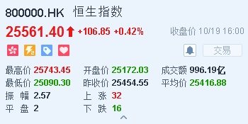 智通财经APP获悉,恒指早盘低开282点报25172,期后继续下探,最低报25090点挫364点。午后恒指反涨,截至收盘,恒生指数涨106.85点或0.42%,报25561.4点,全日成交额达996.19亿。国企指数涨0.84%,报10222.18点,红筹指数涨0.52%,报4137.2点。