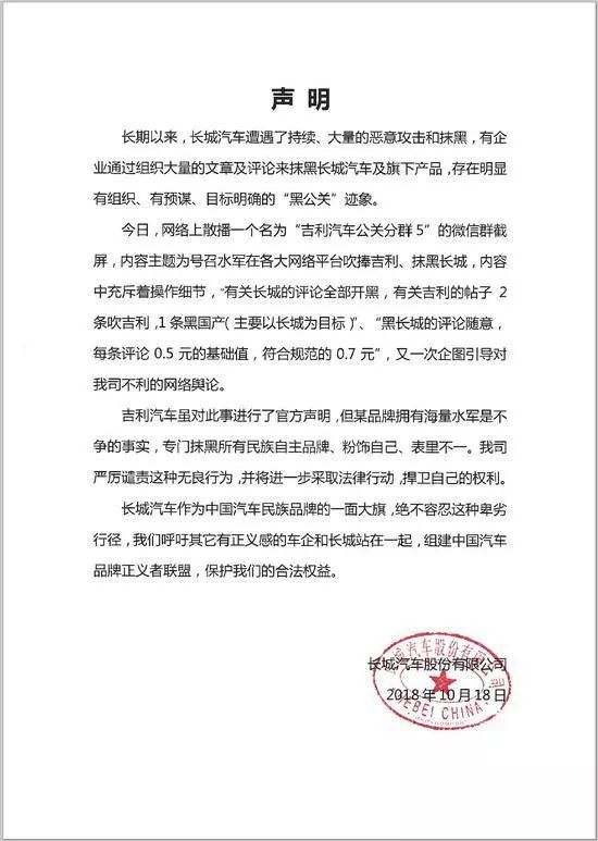 这则声明将抹黑行为的始作俑者指向了吉利汽车,长城汽车声明中指出“吉利汽车虽对此事进行了官方声明,但某品牌拥有海量水军是不争的事实,专门抹黑所有民族自主品牌、粉饰自己、表里不一。”