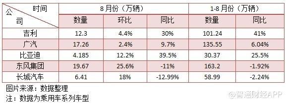 在8月份的数据中,自主品牌中,吉利、比亚迪以及上汽自主品牌销量增速相当不错,首8个月销量增长分别为41%、25.5%和46.82%,广汽的自主品牌和整体销量增速差距不大,在6%左右,长城、东风以及长安销量则是下滑的。