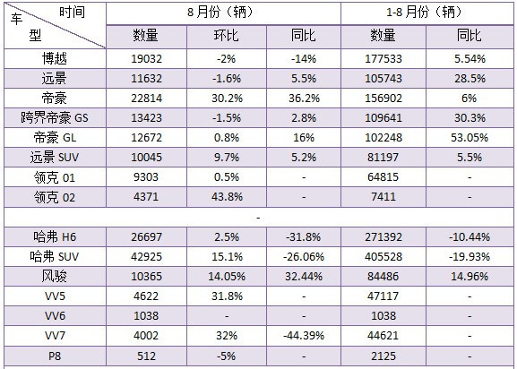 以下为吉利和长城8月份及首8个月各主要车型的销量情况: