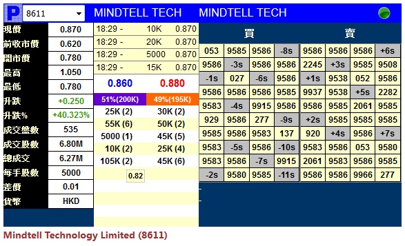 智通财经APP获悉,Mindtell Technology Limited(08611)将于10月20日挂牌,上市前夕,据辉立交易场资料显示,暗盘收报0.87港元,较招股价0.62港元,涨0.25或40.32%。每手5000股,不计手续费,每手盈利1250港元。