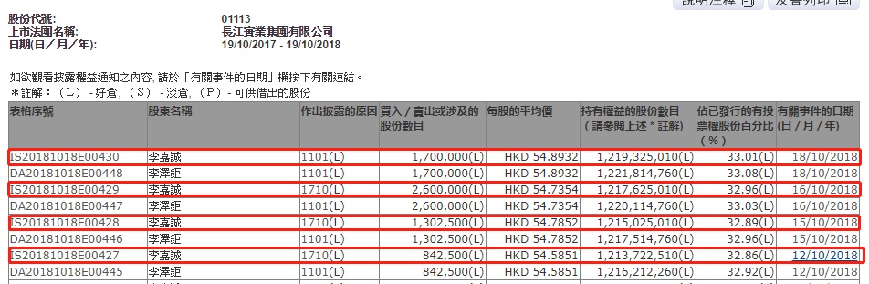 智通财经APP获悉,根据香港联交所资料显示,李嘉诚于于10月12日、15日、16日及18日共增持长实集团(01113)644万股,每股作价54.8港元,总值约3.5亿港元,最新持股量增至33.01%。