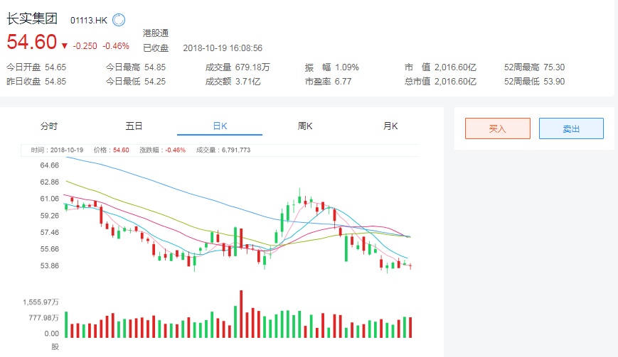截至今日收盘,长实集团(01113)报54.6港元,跌0.25或0.46%。