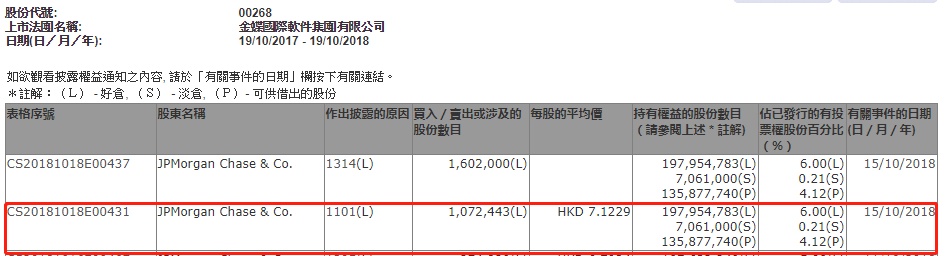 智通财经APP获悉,根据香港联交所资料显示,摩根大通于10月15日增持金蝶国际(00268)107万股,每股作价7.1港元,总值约759万港元,最新持股量增至6%。
