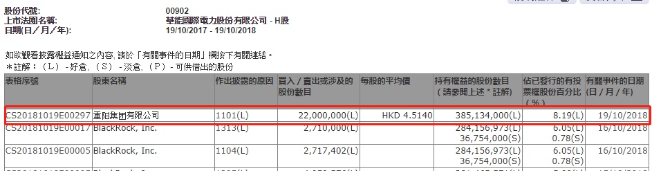 智通财经APP获悉,根据香港联交所资料显示,重阳集团于10月19日增持华能国际电力(00902)2200万股,每股作价4.5港元,总值约9900万港元,最新持股量增至8.19%。