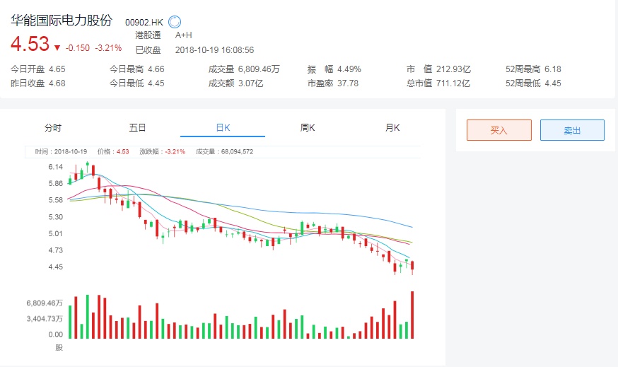 截至今日收盘,华能国际电力(00902)报4.53港元,跌0.15或3.21%。