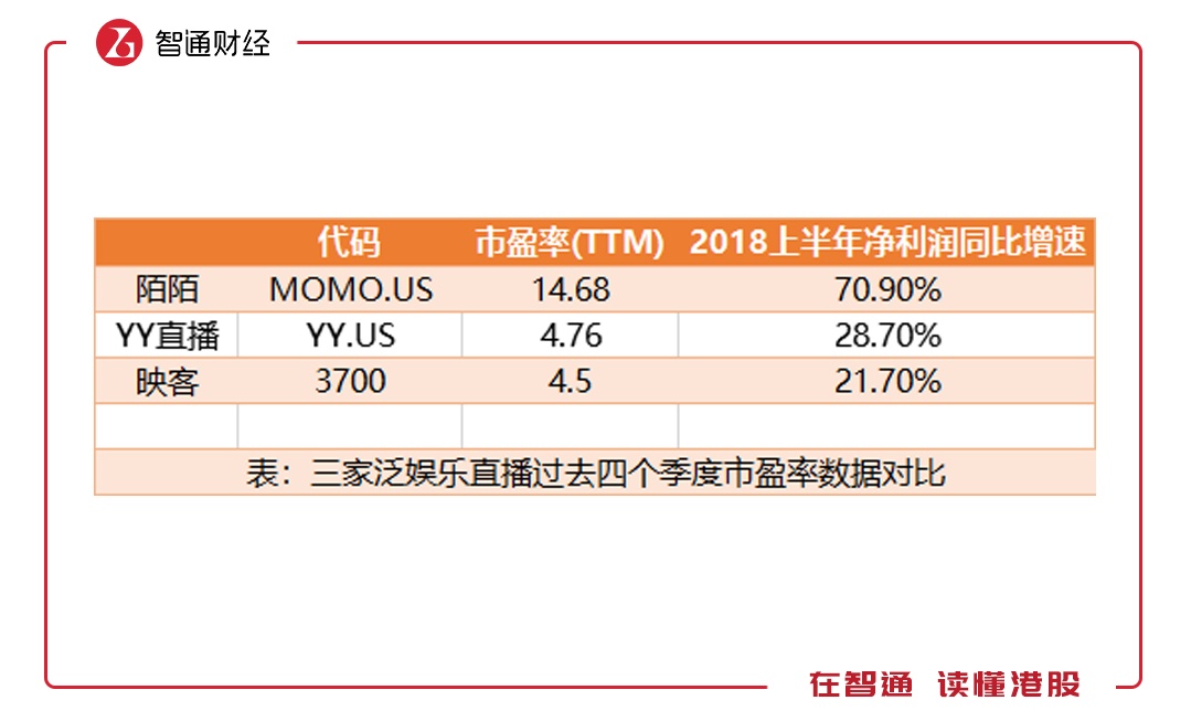 截至2018年6月30日止的四个季度,陌陌的市盈率(TTM)为14.68倍,映客的市盈率(TTM)为4.5倍。可以看到,同为泛娱乐直播,陌陌的市盈率明显要高于YY直播和映客,而后两者的市盈率则“不相上下”。