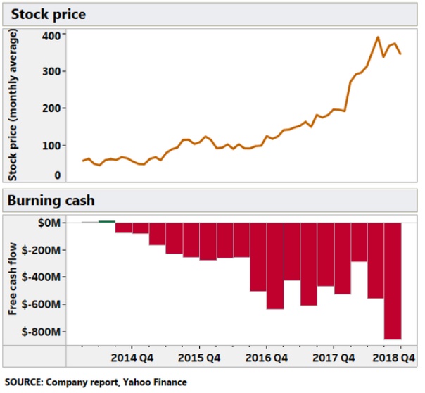 奈飞的现金流已连续4年为负,但并不影响其股价屡创新高。投资者认为,建立独家原创内容库可以帮助奈飞获得订阅用户数量,并抵御流媒体视频中的新竞争者,而这一些与其背后的资金支持分不开。