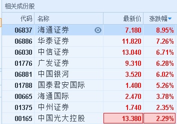智通财经APP获悉,受益于市场情绪恢复,并购重组将大幅增加,中资券商股早盘全线拉升,截至9时46分,海通证券(06837)涨8.95%,报价7.18港元,华泰证券(06886)涨7.26%,中信证券(06030)涨6.71%,广发证券(01776)涨6.28%,国泰君安国际(01788)涨5.26%,报1.4港元。