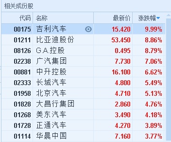 智通财经APP获悉,汽车股集体走高,吉利汽车(00175)领涨板块,盘中涨超一成,贡献指数23点。截至11时47分,吉利汽车涨9.99%,报价14.52港元,比亚迪(01211)涨8.86%,报53.45港元,广汽集团(02238)涨7.06%,报7.73港元,长城汽车(02333)涨5.49%,报4.8港元,华晨中国(01114)涨3.77%,报7.16港元。