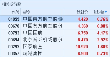 智通财经APP获悉,获大和唱好,航空股整体大涨,截至14时44分,南方航空(01055)涨6.76%,报价4.42港元,东方航空(00670)涨6.08%,报4.36%,中国国航(00753)涨4.17%,报6.75港元,首都机场(00694)涨2.92%,报8.47港元。