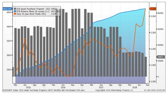 图注:灰色 - 欧洲央行资产购买规模,蓝色 - 欧洲央行资产负债表,橙色 - 意大利BTP债券