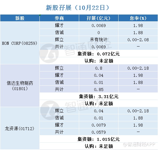 智通财经APP获悉,HON CORP(08259)、信达生物制药(01801)、龙资源(01712)正在招股中。截至10月22日,辉立、信诚、耀才三家券商,为HON CORP(08259)、信达生物制药(01801)、龙资源(01712)分别借出0.072亿、3.31亿、1.015亿孖展金,认购未足额。