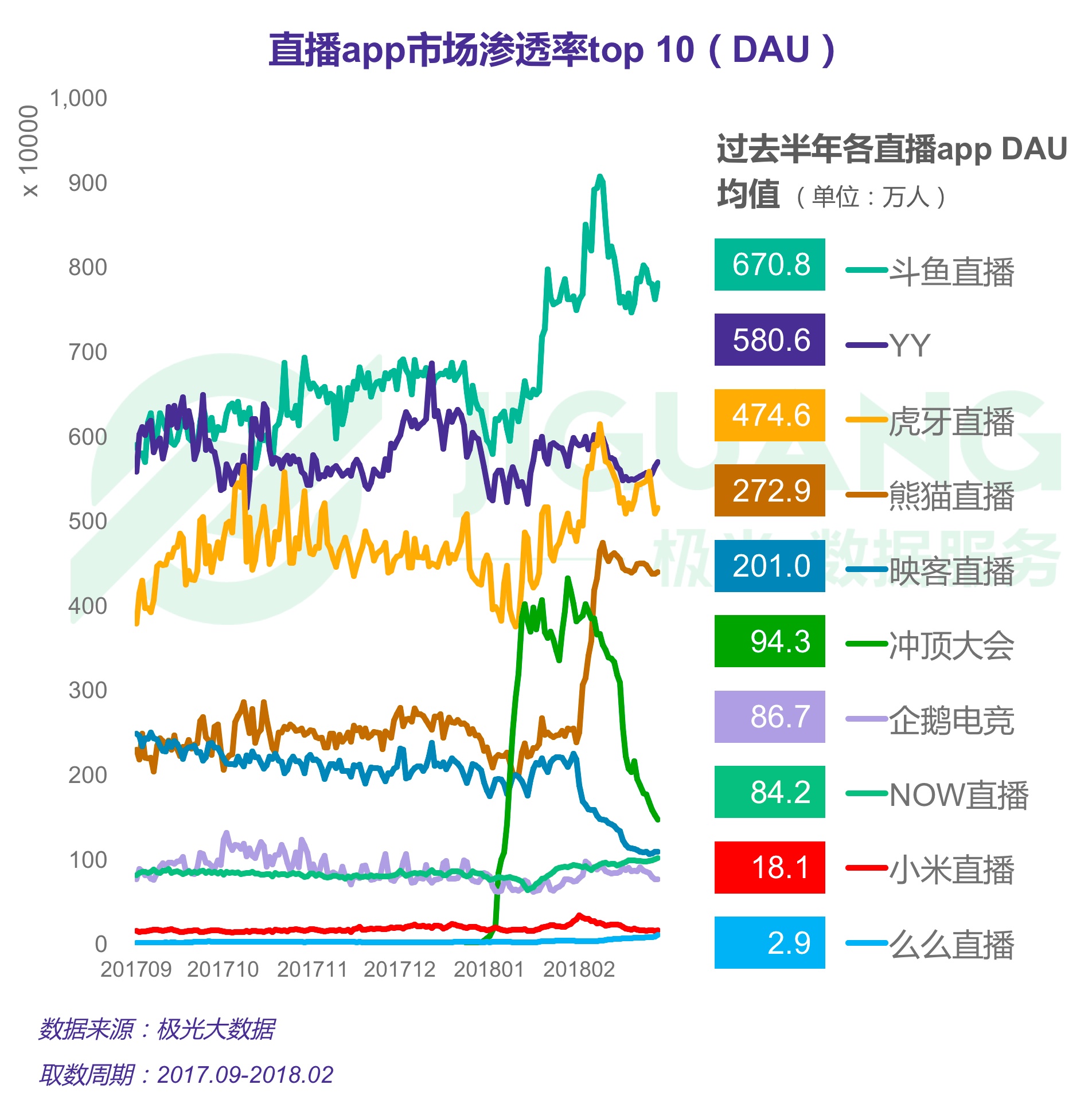据极光大数据发布的行业数据显示,截至今年2月份时最后一周,市场渗透率最高的三款直播APP为斗鱼直播、虎牙直播及YY,三者的渗透率分别为4.25%、3.61%和3.33%。而熊猫直播的渗透率为1.89%,排名第5位,渗透率远远低于同为游戏直播平台的斗鱼、虎牙。