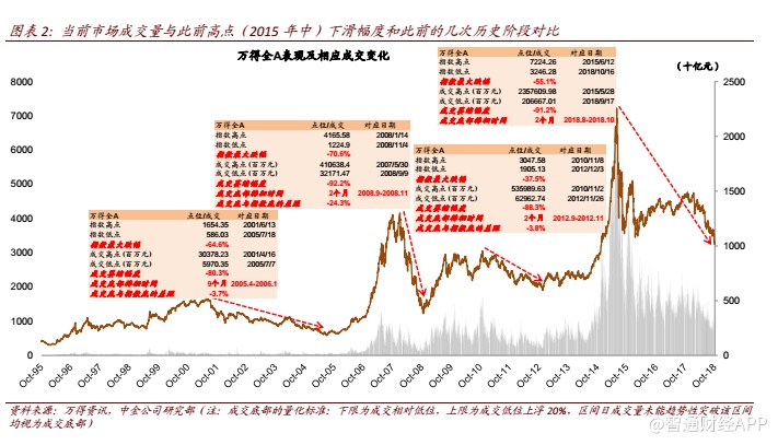1) 成交量萎缩的“1/11”现象:在散户参与度较高的A股市场,上行期的顶部交易量与随后的下行底部交易量之间有个大约的 11:1 关系(即底部成交约为前期成交顶部的 1/11)。市场本轮下跌前的成交量单日高峰达到约 2.4 万亿元左右,前期 A 股日均成交量也已经下行至 2200 亿元附近,在接近这一历史规律。