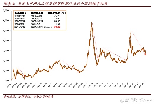 2) 下跌幅度中位数70%附近。历史上的几次深度调整时期,如1993-1994 年、2001-2005 年、2007-2008 年,个股的下跌幅度中位数均在 70%左右(分别为 75%/76%/69%,2009-2014 年由于存在结构性行情,跌幅中位数为 12%)。当前市场个股与 2015 年中的高点相比,跌幅中位数已经达到 73%。从估值调整幅度来看,2008 与2014 年低点时动态市盈率较前期高点下滑中位数分别为 72%和51%,动态市净率下滑中位数为 75%和 57%。目前市场动态市盈率和动态市净率较 2015 年高点时期的下滑中位数分别为 78%和 79%。