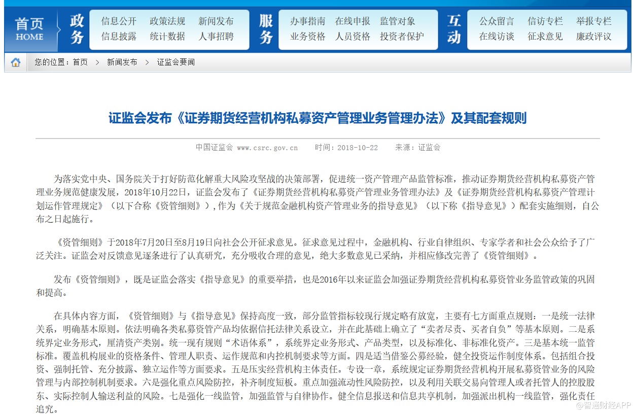 为落实党中央、国务院关于打好防范化解重大风险攻坚战的决策部署,促进统一资产管理产品监管标准,推动证券期货经营机构私募资产管理业务规范健康发展,2018年10月22日,证监会发布了《证券期货经营机构私募资产管理业务管理办法》及《证券期货经营机构私募资产管理计划运作管理规定》(以下合称《资管细则》),作为《关于规范金融机构资产管理业务的指导意见》(以下称《指导意见》)配套实施细则,自公布之日起施行。