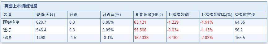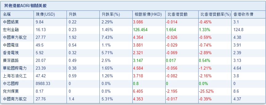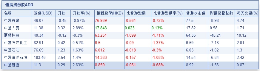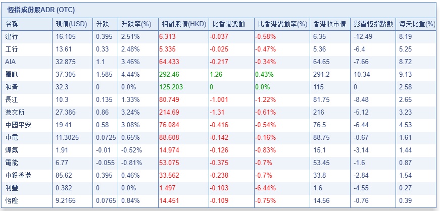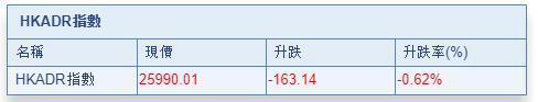 港股ADR指数小幅下跌,按比例计算,收报25990.01,下跌-163.14或-0.62%。其中汇丰控股收报63.121元,较港收市跌1.91%,渣打收报55.566元,较港收市跌1.13%,腾讯收报292.46元,较港收市涨0.43%。