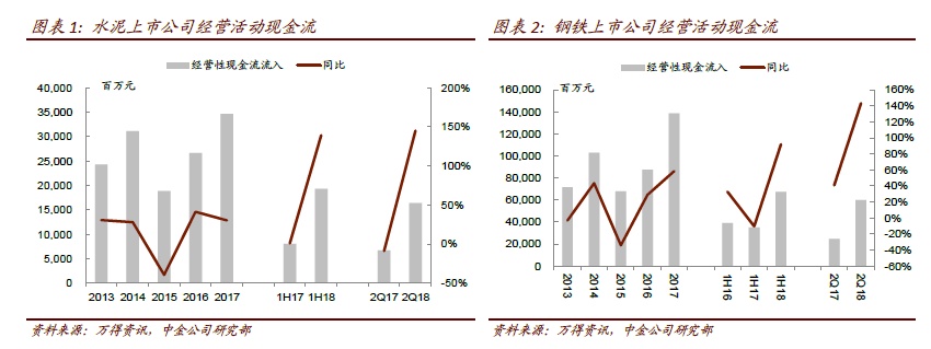中金表示,自2015年以来,受供给侧改革、环保等因素驱动,大宗商品各板块盈利和现金流显著改善,2018年上半年煤炭、钢铁、水泥上市公司经营活动现金流较2015年上半年分别增加 129%、128%、271%,且债务净偿还相对经营现金流比例有所上升,派息率相对稳定。