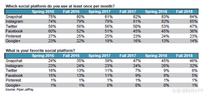 智通财经APP获悉,据著名投行派杰(Piper Jaffray)周一公布的关于2018年秋季青少年最常用社交平台的调查中,Facebook旗下Instagram自2016年以来首次超过Snapchat,成为全美青少年使用最多的社交APP。数据显示,85%的青少年每月至少使用一次Instagram,打败了使用率为84%的Snapchat。
