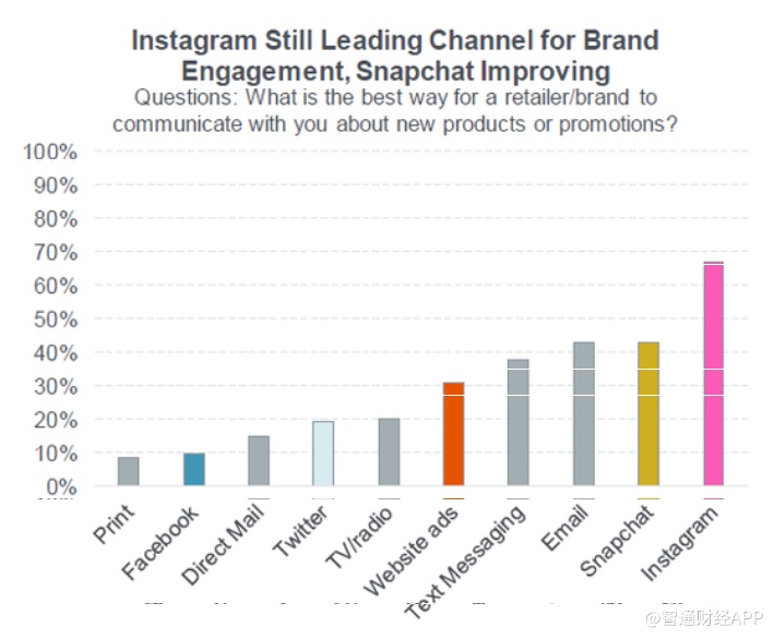 派杰指出,Instagram对营销人员的吸引力也在增长,“近70%的青少年表示他们更喜欢品牌就新品通过Instagram与他们联系。 Snapchat在这项调查中排在电子邮件之前排名第二,比例仅超过40%。”