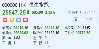 智通财经APP获悉,美股股指期货大跌,市场担心美股跌势延续,恒生指数跌超600点。截至11时46分,跌605.9点或2.32%,报价25547.25点,成交额494.84亿