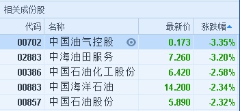 智通财经APP获悉,受国际油价下跌影响,“三桶油”均跌超2%,截至13时58分,中石化(00386)跌2.58%,报价6.42港元,中海油(00883)跌2.34%,报14.2港元,中石油(00857)跌2.32%,报5.89港元。