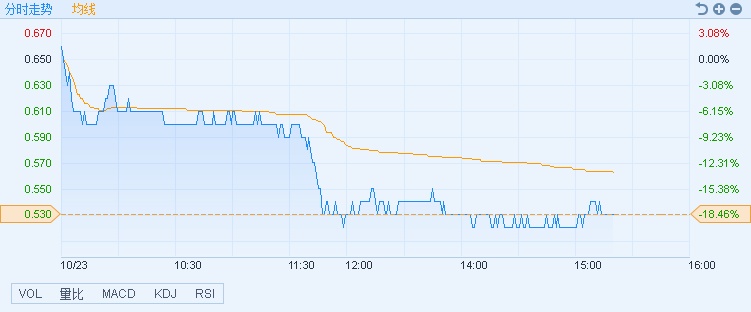 智通财经APP获悉,中滔环保(01363)股价持续走低,盘中创59个月新低。截至15时19分,跌18.46%,报价0.53港元,成交额1661.32万。