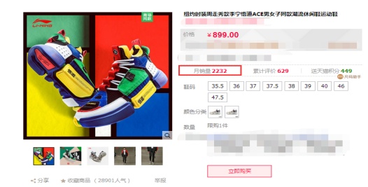 产品销量方面,李宁于今年二月登上纽约时装周的一款售价899元的“悟道”运动鞋,月销量为2232笔,单月贡献销售额超过200万元。