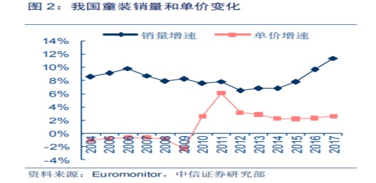 从行业来看,中国童装市场在二胎政策放开及80、90后年轻父母成为童装消费主力的背景下,童装行业发展势头良好。根据Euromonitor的数据,2017年中国童装市场规模约1796亿元,2012-2017年CAGR为11.1%,远高于服装行业的6.2%。量价共同驱动童装规模增长,近年来年销量增速明显提升,价格保持温和提升。