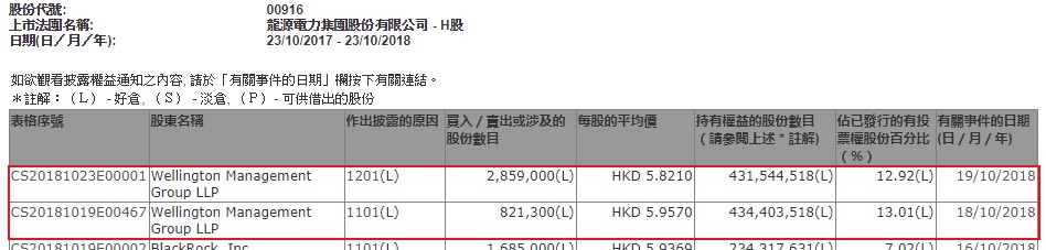 智通财经APP获悉,根据联交所资料显示,威灵顿资产管理于10月19日减持龙源电力(00916)286万股,每股作价5.82元,总值1664万元,最新持股量降至12.92%。