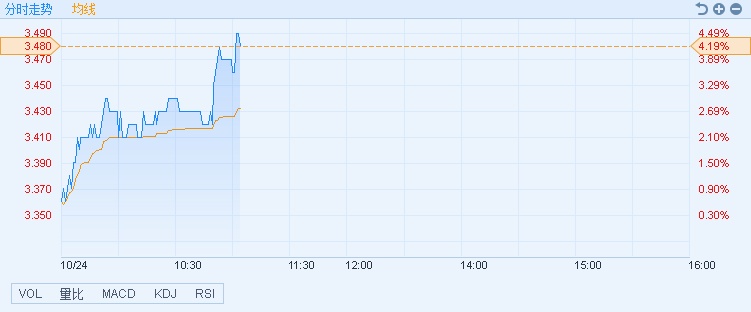 智通财经APP获悉,前三季度股东应占净利润增长76.9%至41.25亿元人民币,中煤能源(01898)股价造好,截至11时03分,涨4.19%,报价3.48港元,成交额3236.94万。