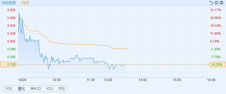 智通财经APP获悉,拟收购一家贷款公司部分权益,麦迪森控股(08057)今早复盘,股价高开低走,截至13时35分,跌14.29%,报价0.33港元,成交额1027.83万。