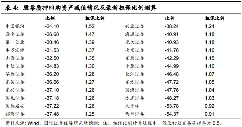 报告初略估算最新收盘时各证券公司股权质押资产减值情况和最新担保比例, 假设初始交易质押率为 0.5, 部分券商股权质押资产整体市值下跌超过四成,从担保比例来看,大部分券商低于 1.3 倍,可见股权质押风险局势紧张。券商股的超低估值也充分反映了业务爆仓对券商净资产的担忧。近期,监管层密集发生合力化解股权质押业务风险,重视程度前所未有,预计股权质押业务风险逐步得到缓解, 券商股估值具备较大的估值修复空间。