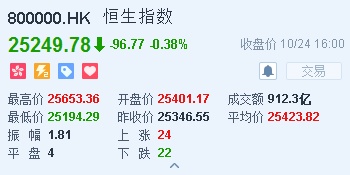 智通财经APP获悉,恒生指数开盘涨0.22%,报25401.17点,盘中曾低见25194点。截至收盘,恒生指数跌96.77点或0.38%,报25249.78点,全日成交额达912.3亿。国企指数跌0.08%,报10226.41点,红筹指数跌0.37%,报4096.2点。