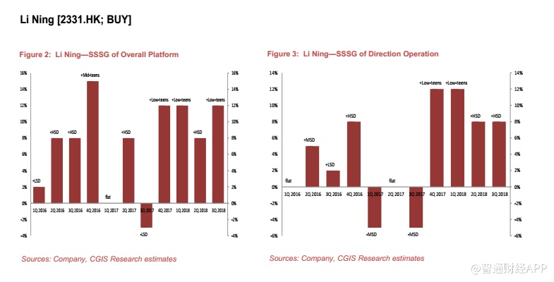 总体来说,季度表现出现回升,整体同店销售增长率达到10%以上,较第二季度的高单位数增长有所改善。这主要受到强劲的批发同店销售增长(高单位数)所推动(2018年二季度:低单位数)。尽管电商业务略有放缓,但继续录得较高增长(略高于30%)。总的来说,我们认为此次季度数据不俗。