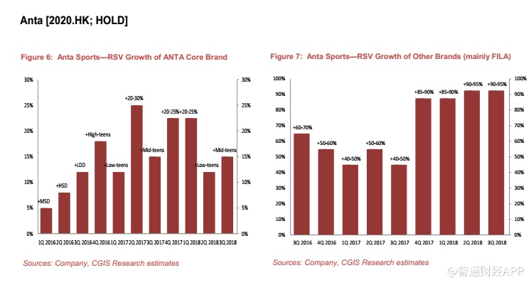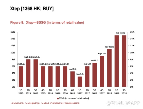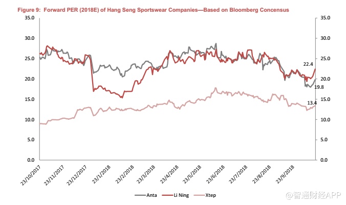 耐克还公布了强劲的18财年一季度(2018年6月至8月)数据,若撇除汇率影响,大中华区的销售额实现了20%的增长,反映其市场份额持续增长。阿迪达斯将于2018年11月7日公布18财年三季度(7月至9月)数据。我们认为市场将关注其中国地区业绩。此前,其积极的在线促销活动引发了对行业库存水平以及全行业价格战的担忧。根据国内品牌的说法,阿迪达斯的进取促销是其自身的问题,这是因为它在批发业务方面非常进取,这可能使公司存在一些库存问题。我们目前不认为这对国内企业构成很大问题,因为它们的产品大部分针对不同的客户群。