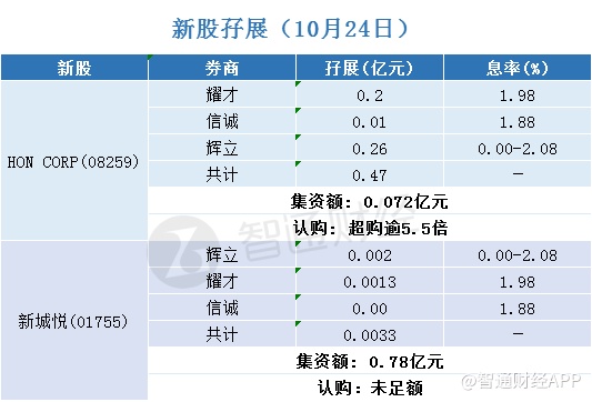 智通财经APP获悉,HON CORP(08259)、新城悦(01755)正在招股中。截至10月24日,辉立、信诚、耀才三家券商,为HON CORP(08259)、新城悦(01755)分别借出0.072亿、0.78亿孖展金;其中,新城悦(01755)认购未足额,HON CORP(08259)认购逾5.5倍。