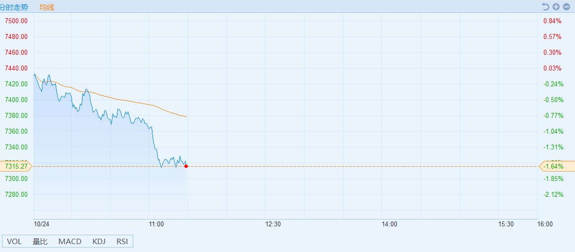 智通财经APP获悉,以波音为代表的权重股财报靓丽,但市场情绪依然谨慎。道指周三小幅高开,标普500大盘和纳指则小幅低开,之后三大指数震荡向下,截至发稿,跌幅扩大,三大股指跌幅超过1%。道指跌263点或1.04%,报24928点,跌破25000点关口;纳指跌1.54%或114点,报7323点;标指跌超1%或29.86点,报2710.83。