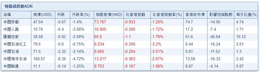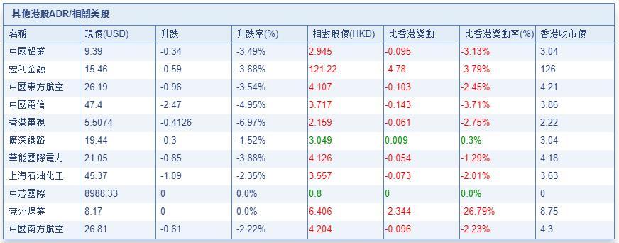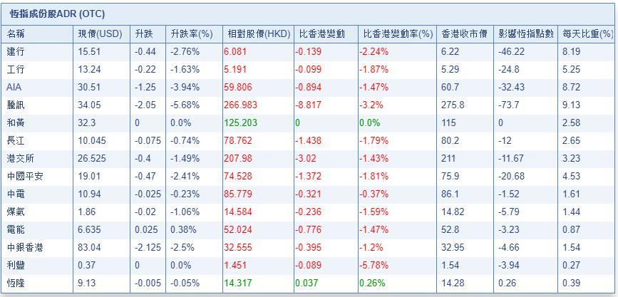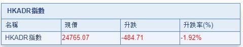 港股ADR随美股大幅下跌,按比例计算,收报24765.07,下跌484.71或1.92%。其中汇丰控股收报60.771元,较港收市跌1.35%,保诚收报151.244元,较港收市跌2.42%,中国石油收报5.606,较港市跌3.51%,腾讯收报266.983元,较港收市跌3.2%。中国平安收报74.528元,较港收市跌1.81%。