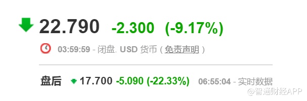 芯片巨头AMD在美股市场周三收盘后公布三季度财报,因季度营收未能达到分析师预期,股价盘后狂泄逾22%,报17.7美元。其股价在周三的常规交易中已暴跌9.17%,报22.79美元。