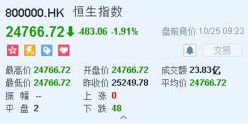 智通财经APP获悉,美股周三(10月24日)再遭重挫,科技股跌幅领先。恒生指数开盘跌1.91%,报24766.72点。国企指数跌2.13%,报10008.79点。红筹指数跌1.63%,报4029.43点。大市盘前成交23.83亿港元。