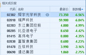智通财经APP获悉,手机产业链集体下挫,截至10时02分,舜宇光学(02382)跌6.56%,报价73.35港元,瑞声科技(02018)跌6.04%,报59.9港元,高伟电子(01415)跌4.35%,报0.88港元,丘钛科技(01478)跌3.16%,报3.99港元。