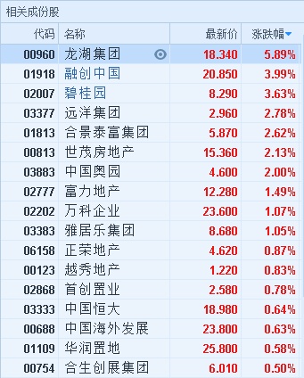 智通财经APP获悉,内房股午后强势反弹,截至14时37分,龙湖集团(00960)涨5.89%,报价18.34港元,融创中国(01918)涨3.99%,报20.85港元,碧桂园(02007)涨3.63%,报8.29%港元,中国奥园(03883)涨2%,报4.6港元,中国恒大(03333)涨0.64%,报18.98港元。