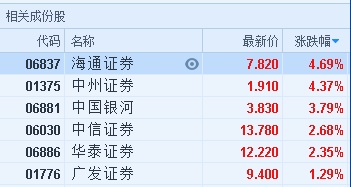 智通财经APP获悉,午后A股多只券商股涨停,港股券商股随A股强势上涨,截至14时45分,海通证券(06837)涨4.69%,报7.82港元,中国银河(06881)涨3.79%,报3.83港元,中信证券(060330)涨2.68%,报13.78港元,广发证券(01776)涨1.29%,报9.4港元。